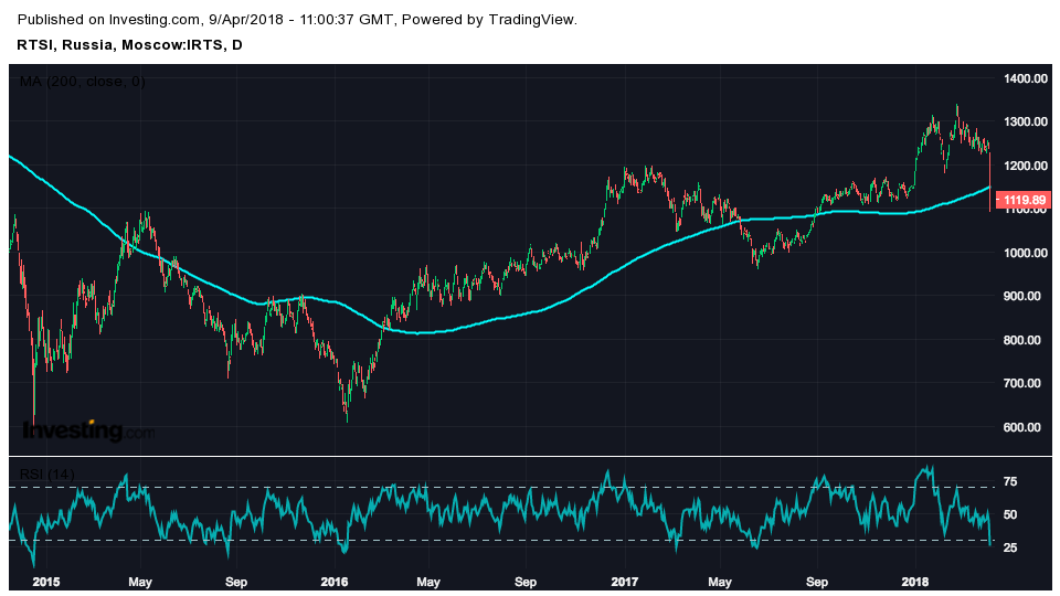 RTS-indexet, som prissätter ryska aktier i dollar, är ned 9,7 procent under pågående handel.