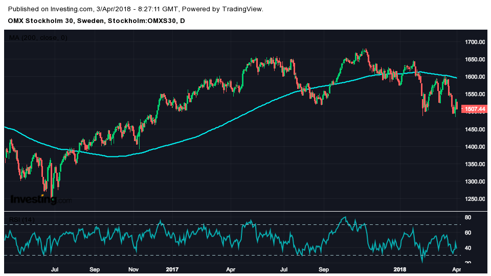 Efter en dryg timmes handel var det utdelningsjusterade OMXS30-indexet ned 1,58 procent, medan det utdelningsjusterade Stockholm All-Share index (SAX) hade backat 1,40 procent.
